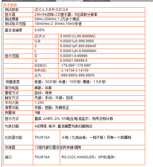 ■ TH2816A型精密LCR数字电桥集成了本公司多年元件测试的成熟经验,运用了本领域的测试技术。该产品强大的测试功能和优越的测量性能使其挤身于同类较高水平,结合以低廉的价格将给予广大客户*的享受。该产品可提供稳定的6位测试分辨率,50Hz-100kHz/200kHz的频率范围、0.01V-2.0V可编程信号电平、高达30次/秒的测量速度、9级精细量程、恒定的30Ω或100Ω源内阻及灵活人性的操作方式, 可满足生产线质量保证、进货检验及实验室高度测量要求。该产品提供的HANDLER、GPIB及RS232C接口为仪器使用于元件自动分选系统、与计算机通讯及测试过程纪录创造了良好的条件。同惠TH2816A型LCR数字电桥???
